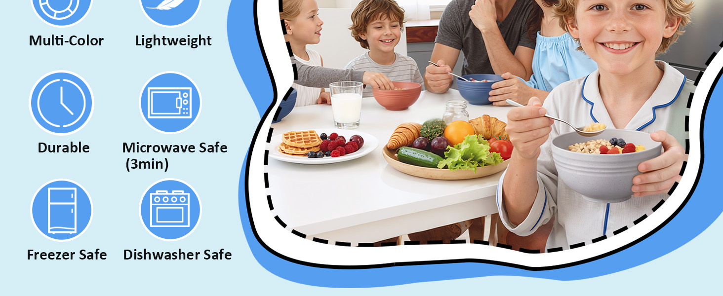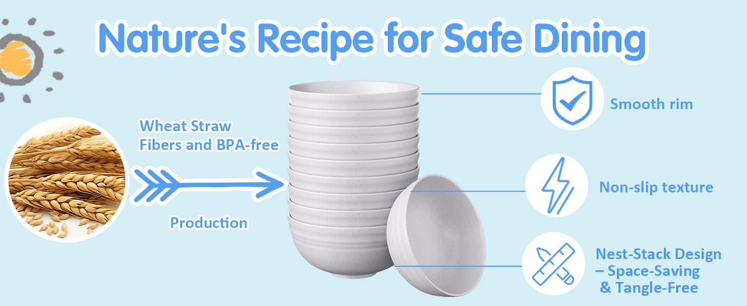 • Safe Material Cereal Bowls: Made from natural wheat straw fiber, these BPA-free plastic bowls are 100% food-safe for the whole family. Their smart stackable design saves space while preventing sticking—making them healthy and convenient