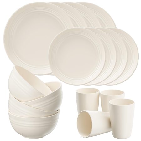 Quatish 16 Piece Plates and Bowls Sets for 4, Unbreakable Dinnerware Sets, Plastic Dish Set for Camping, Dishwasher Microwave Safe, Outdoor Kitchen and Apartment Dinning RV Essentials, Beige